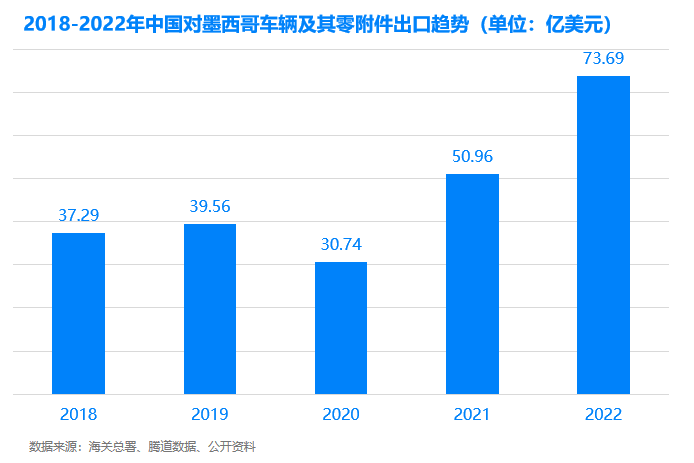 中国对墨西哥车辆及零附件产品的出口额趋势在经历2020的低谷之后,实现三级跳。2022年,出口额同比增长44.6%,相比2018年增长97%;在出口量方向,墨西哥是我国汽车出口最多的国家,同比增长了170%。
